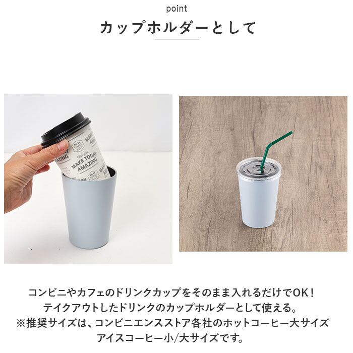 ・コンビニやカフェのドリンクカップをそのまま入れるだけでOK!テイクアウトしたドリンクのカップホルダーとして使える。