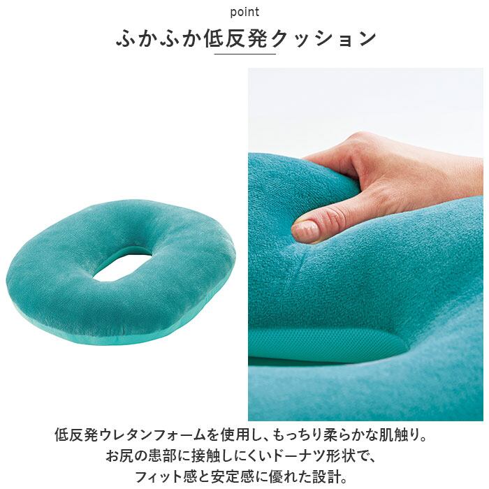・低反発ウレタンフォームを使用し、もっちり柔らかな肌触り。お尻の患部に接触しにくいドーナツ形状で、フィット感と安定感に優れた設計。