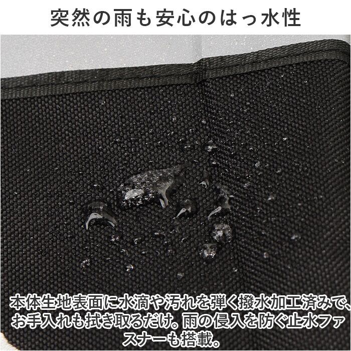 ・本体生地表面に水滴や汚れを弾く撥水加工済みで、お手入れも拭き取るだけ。雨の侵入を防ぐ止水ファスナーも搭載。