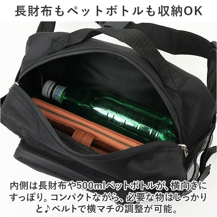 ・内側は長財布や500mlペットボトルが、横向きにすっぽり。コンパクトながら、必要な物はしっかりと♪ベルトで横マチの調整が可能。