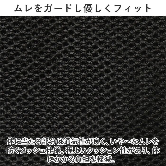 ・体に当たる部分は通気性が良く、いや~なムレを防ぐメッシュ仕様。程よいクッション性があり、体にかかる負担を軽減。