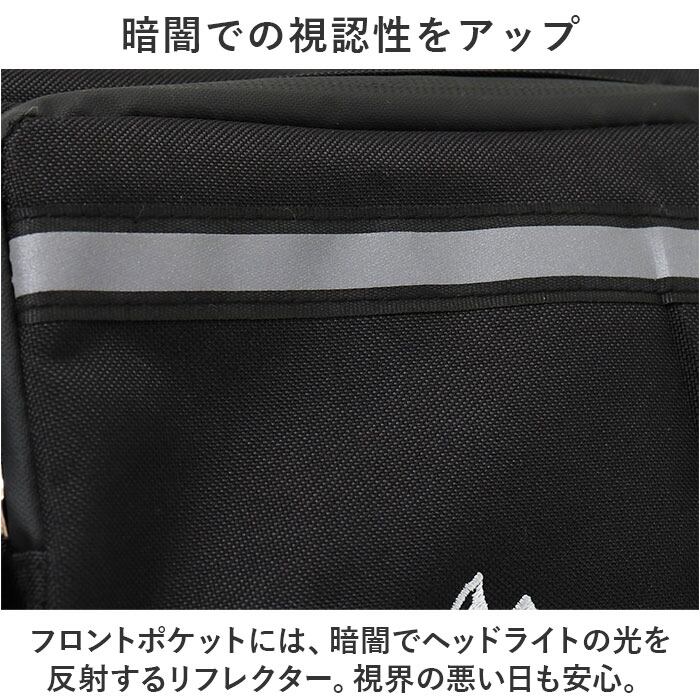 ・フロントポケットには、暗闇でヘッドライトの光を反射するリフレクター。視界の悪い日も安心。