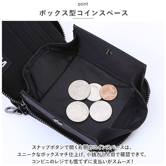 ・スナップボタンで開く右側のコインスペースは、ユニークなボックスマチ仕上げ。小銭がひと目で確認できて、コンビニのレジでも慌てずに支払いがスムーズ!