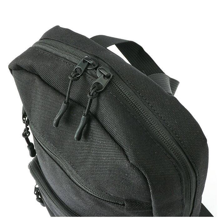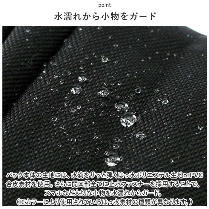 ・バック本体の生地には、水滴をサッと弾くはっ水ポリエステル生地orPVC合皮素材を使用。さらに開口部全てに止水ファスナーを採用することで、スマホなど大切な小物を水濡れからガード。(※カラーにより使用されているはっ水素材の種類が異なります。)