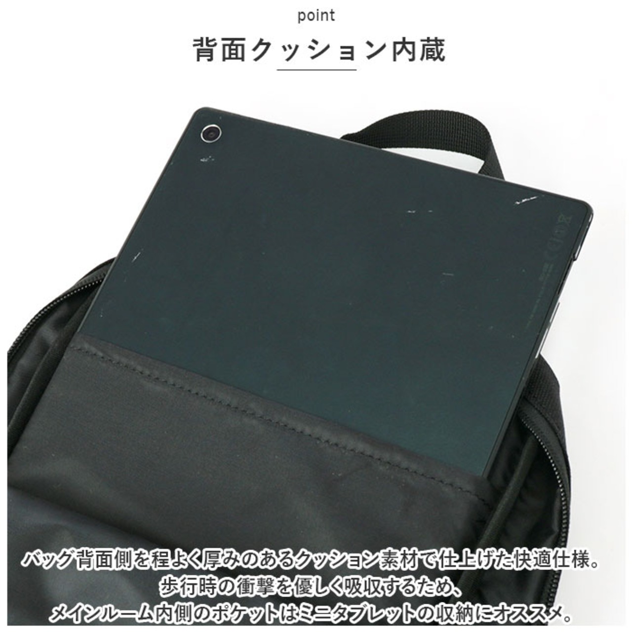 ・バッグ背面側を程よく厚みのあるクッション素材で仕上げた快適仕様。歩行時の衝撃を優しく吸収するため、メインルーム内側のポケットはミニタブレットの収納にオススメ。