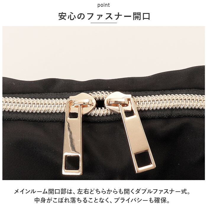 ・メインルーム開口部は、左右どちらからも開くダブルファスナー式。中身がこぼれ落ちることなく、プライバシーも確保。
