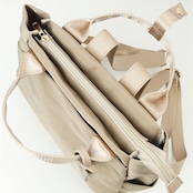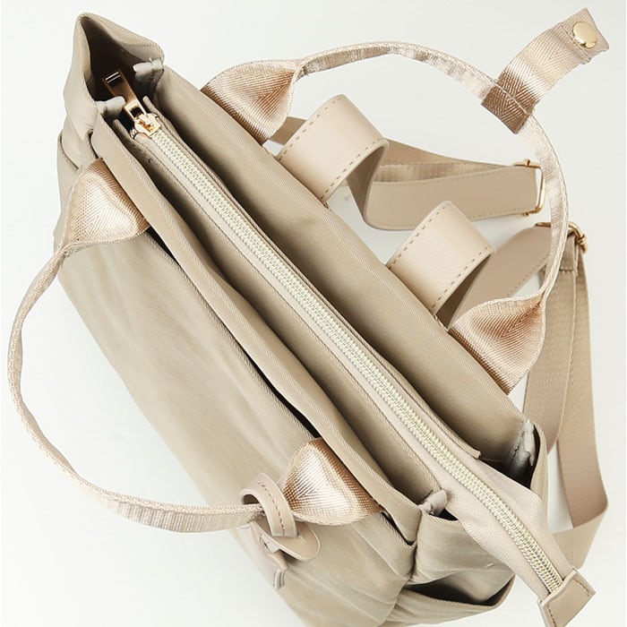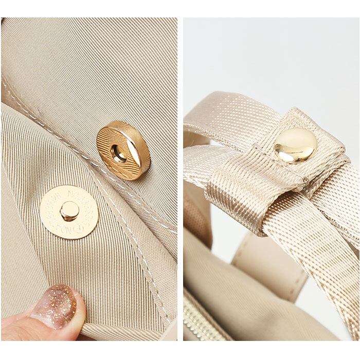 ・程よい光沢感が特徴的なナイロン素材。ゴールドパーツとフェイクレザーのポイント使いで上品な印象をさらにプラスし、持っているだけでおしゃれ度アップ♪