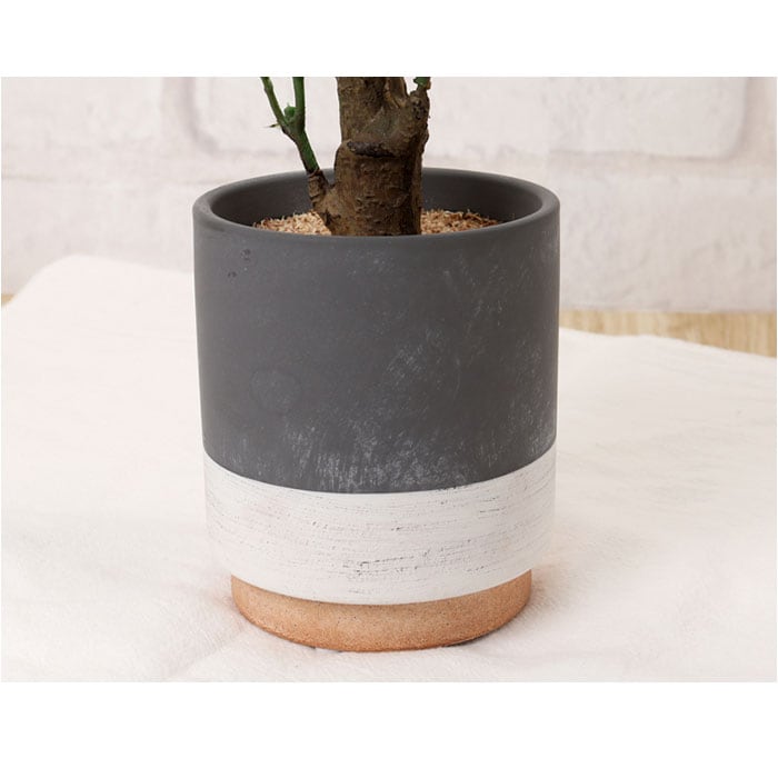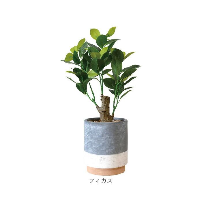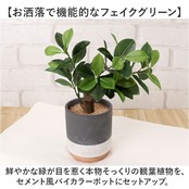 ・鮮やかな緑が目を惹く本物そっくりの観葉植物を、セメント風バイカラーポットにセットアップ。