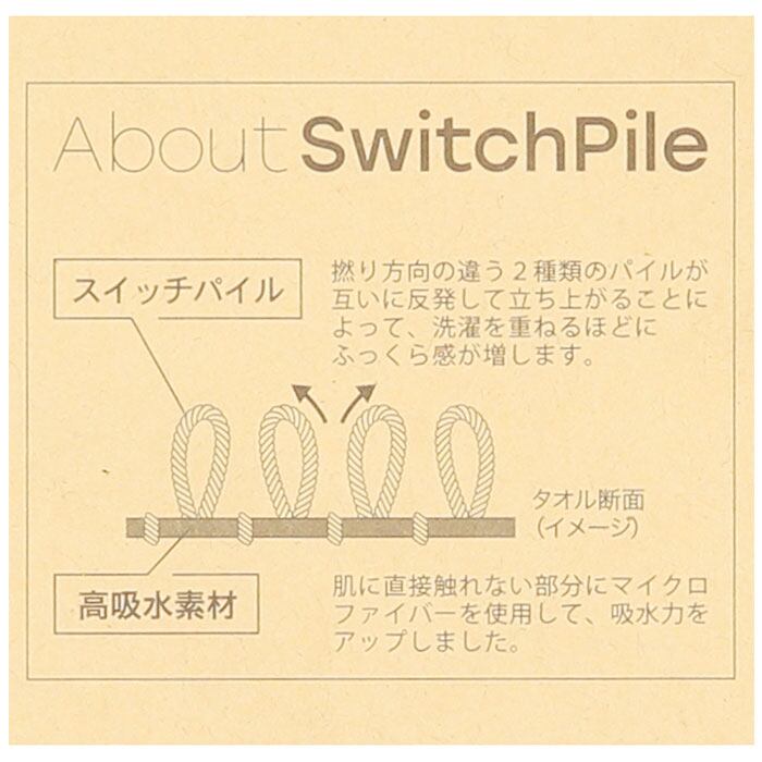 ・”洗うほどに膨らむ”がテーマのスイッチパイル。撚り方向の違う2種類のパイルが互いに反発して立ち上がることにより、洗ってもへたれにくい!洗濯を重ねるほどふっくら感がアップ。