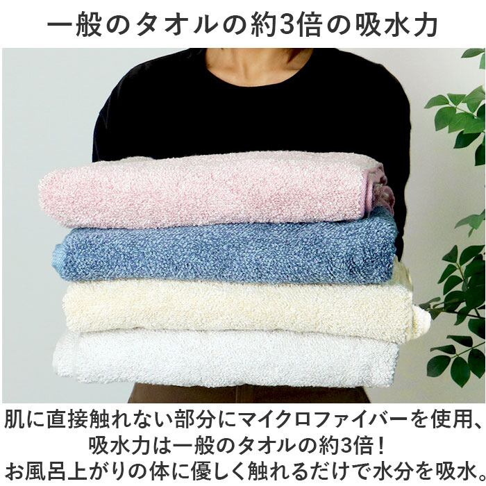 ・肌に直接触れない部分にマイクロファイバーを使用、吸水力は一般のタオルの約3倍!お風呂上がりの体に優しく触れるだけで水分を吸水。