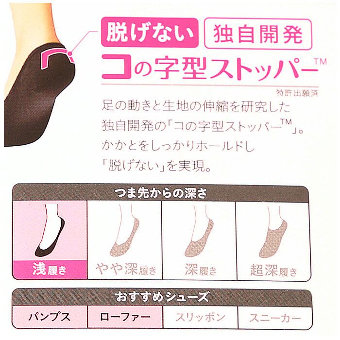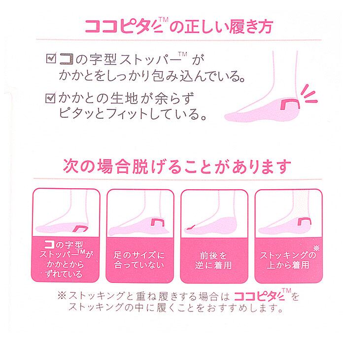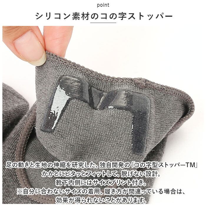 ・足の動きと生地の伸縮を研究した、独自開発の「コの字型ストッパーTM」。かかとにピタッとフィットして、脱げない設計。靴下内側にはサイズプリント付き。(※自分に合わないサイズの着用、履き方が間違っている場合は、効果が得られないことがあります。)