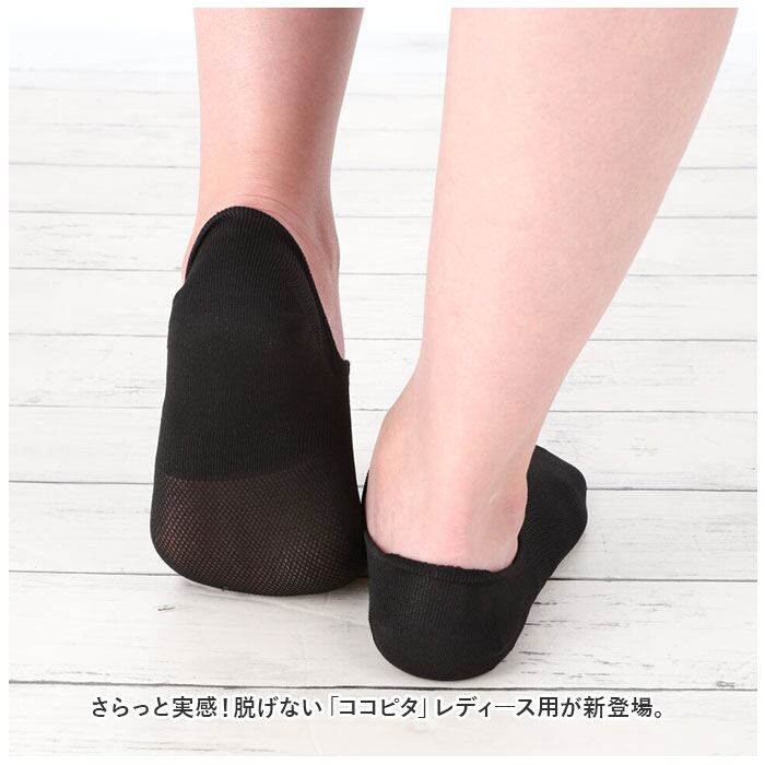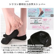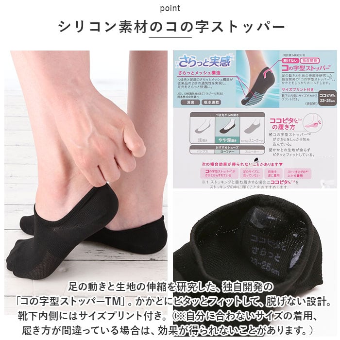 ・足の動きと生地の伸縮を研究した、独自開発の「コの字型ストッパーTM」。かかとにピタッとフィットして、脱げない設計。靴下内側にはサイズプリント付き。(※自分に合わないサイズの着用、履き方が間違っている場合は、効果が得られないことがあります。)