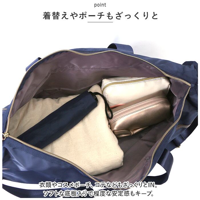 ・衣類やコスメポーチ、コテなどもざっくりとIN。ソフトな底板入りで程度な安定感もキープ。