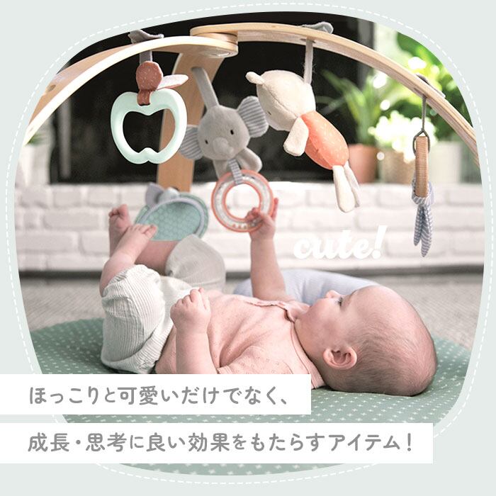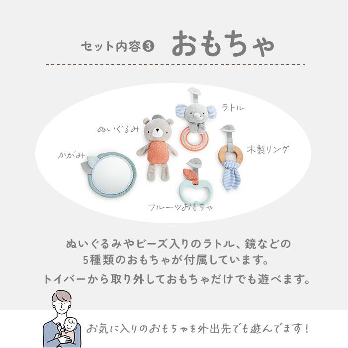 ・ぬいぐるみやビーズのラトルなど5種類のおもちゃが付属。トイバーに取り付けて遊んでも良し、取り外して単体遊びもOK。