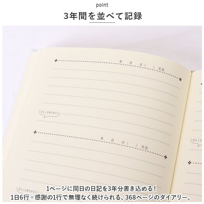 ・1ページに同日の日記を3年分書き込める!1日6行+感謝の1行で無理なく続けられる、368ページのダイアリー。