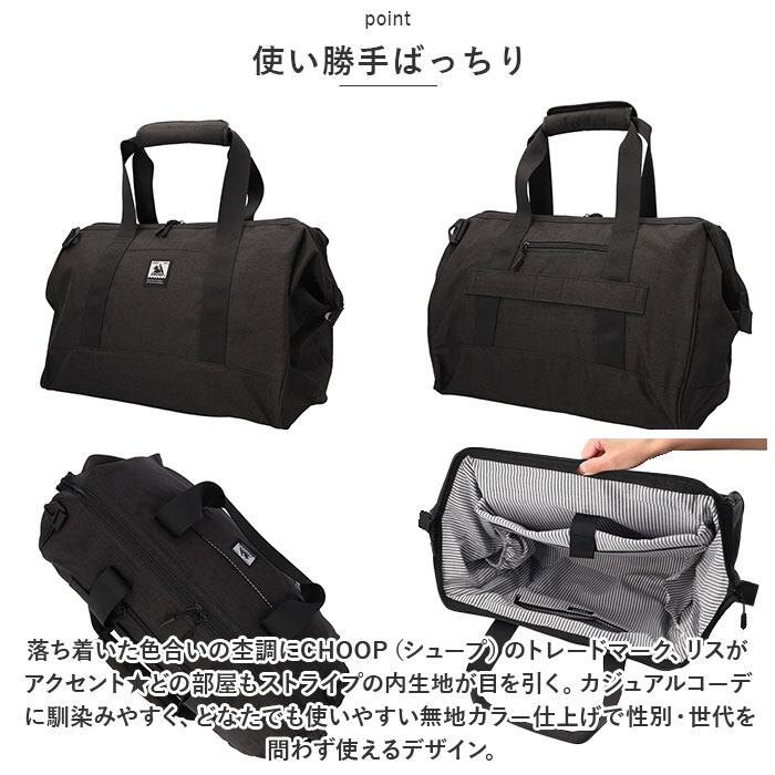・荷物が多くても安心!旅行用だけでなくフィットネスジムや、学生さんの部活用にも活躍!リスのマークがアクセントの「CHOOP ポリキャンボストンバッグ」が新登場。