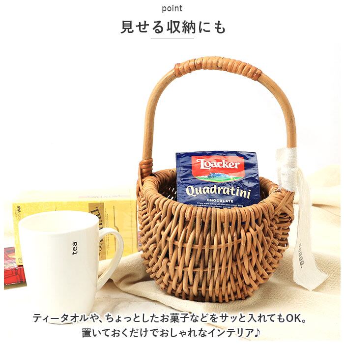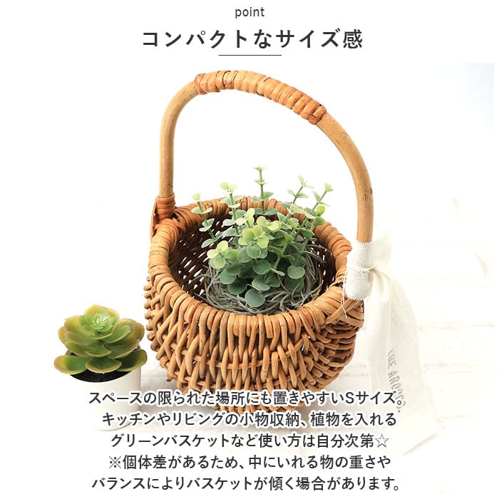 ・スペースの限られた場所にも置きやすいSサイズ。キッチンやリビングの小物収納、植物を入れるグリーンバスケットなど使い方は自分次第☆(※個体差があるため、中にいれる物の重さやバランスによりバスケットが傾く場合があります。)