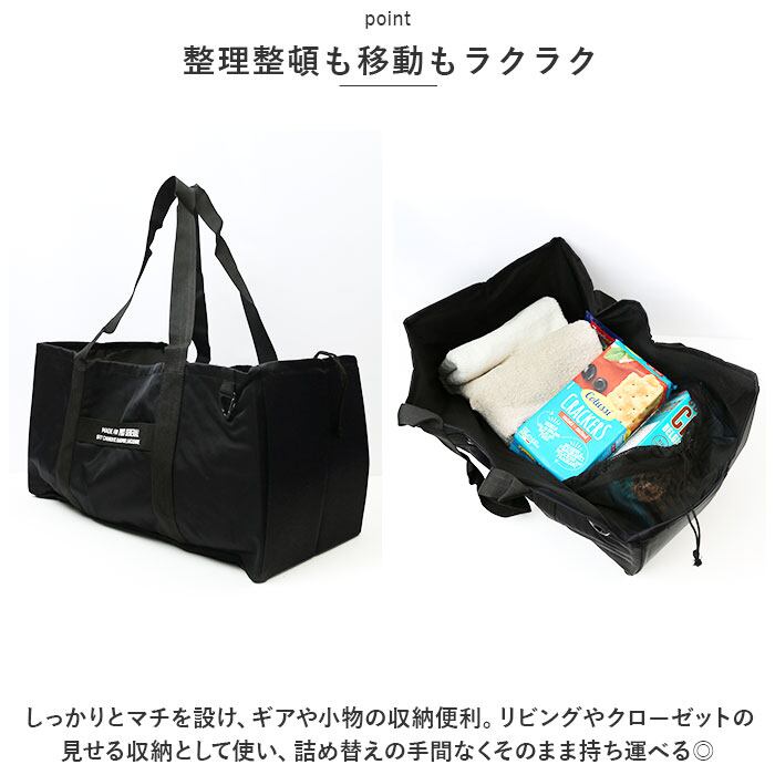 ・しっかりとマチを設け、ギアや小物の収納便利。リビングやクローゼットの見せる収納として使い、詰め替えの手間なくそのまま持ち運べる欲張りアイテム!