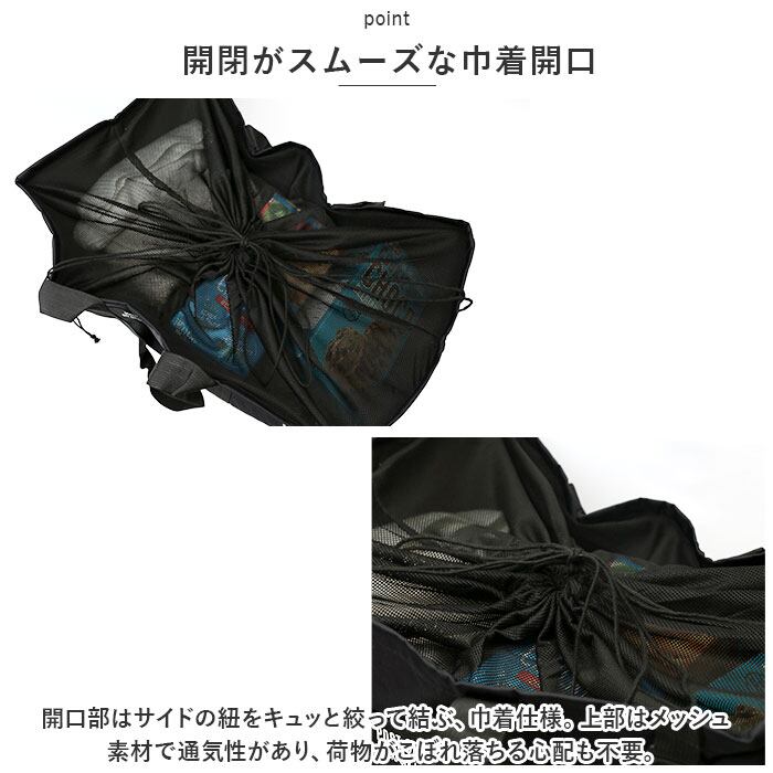 ・開口部はサイドの紐をキュッと絞って結ぶ、巾着仕様。上部はメッシュ素材で通気性があり、荷物がこぼれ落ちる心配も不要。