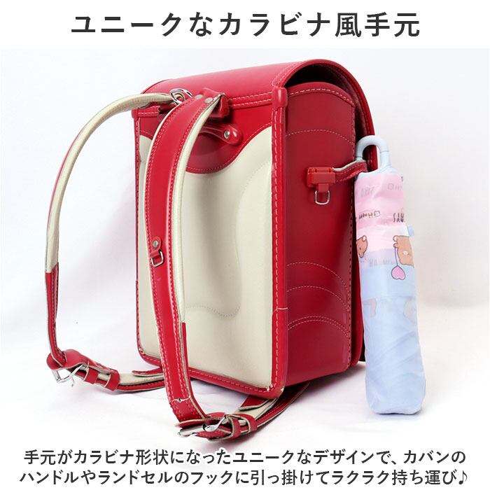 ・手元がカラビナ形状になったユニークなデザインで、カバンのハンドルやランドセルのフックに引っ掛けてラクラク持ち運び♪