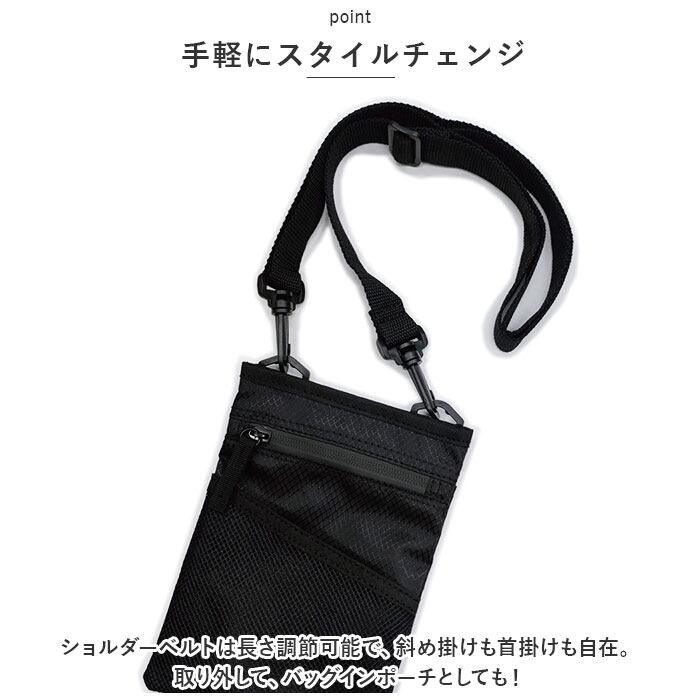 ・ショルダーベルトは長さ調節可能で、斜め掛けも首掛けも自在。取り外して、バッグインポーチとしても!