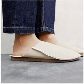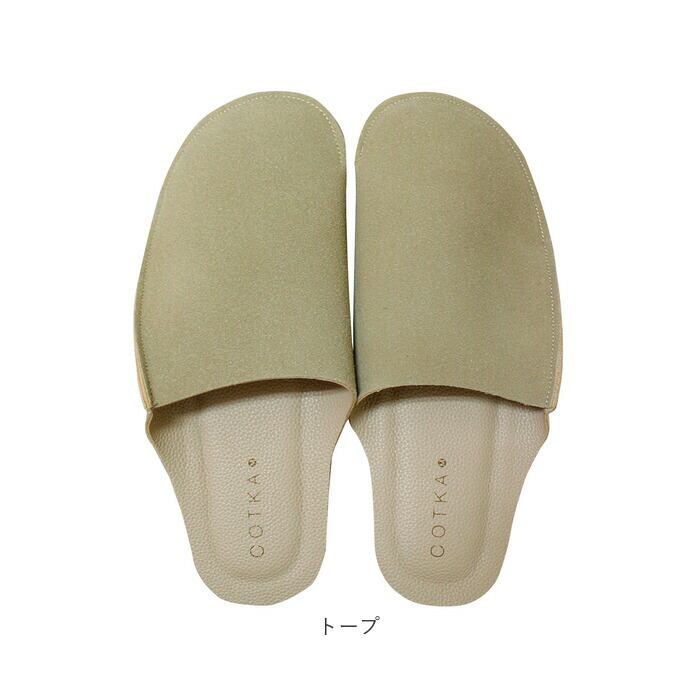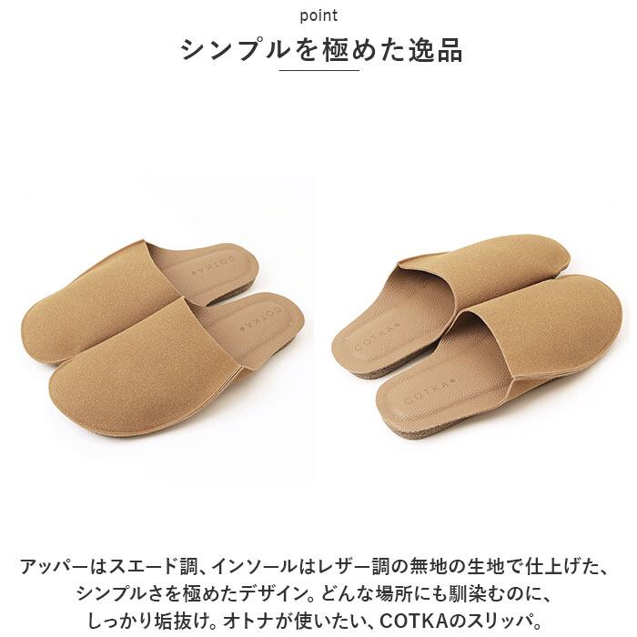 ・アッパーはスエード調、インソールはレザー調の無地の生地で仕上げた、シンプルさを極めたデザイン。どんな場所にも馴染むのに、しっかり垢抜け。オトナが使いたい、COTKAのスリッパ。