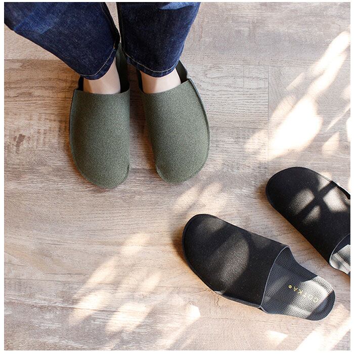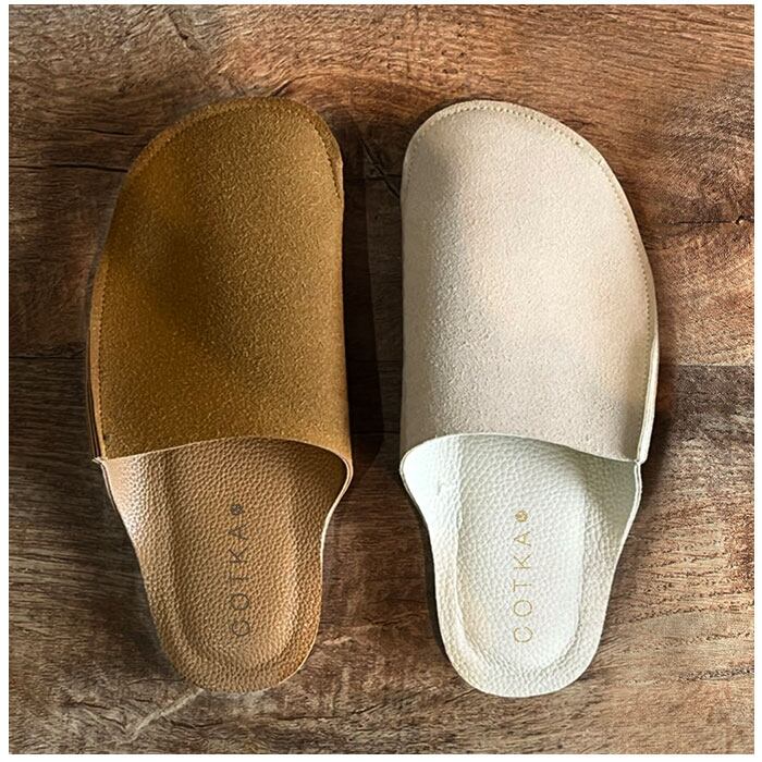 ・アッパーはスエード調、インソールはレザー調の無地の生地で仕上げた、シンプルさを極めたデザイン。どんな場所にも馴染むのに、しっかり垢抜け。オトナが使いたい、COTKAのスリッパ。