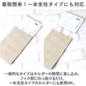 ・一般的なタイプはホルダーの隙間に差し込み、フック部に引っ掛けるだけ。一本支柱タイプのホルダーにも使用OK。