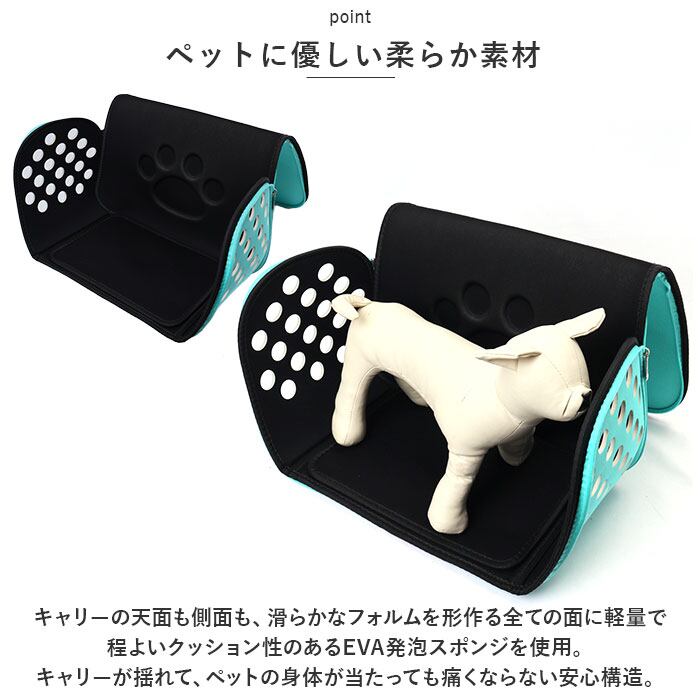 ・キャリーの天面も側面も、滑らかなフォルムを形作る全ての面に軽量で程よいクッション性のあるEVA発泡スポンジを使用。キャリーが揺れて、ペットの身体が当たっても痛くならない安心構造。