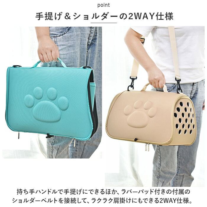 ・ぷっくりと浮き上がった、肉球マークのレリーフがアクセント。ペットと楽しくお出掛けできる「手提げ型2WAYペットキャリー」が新登場。