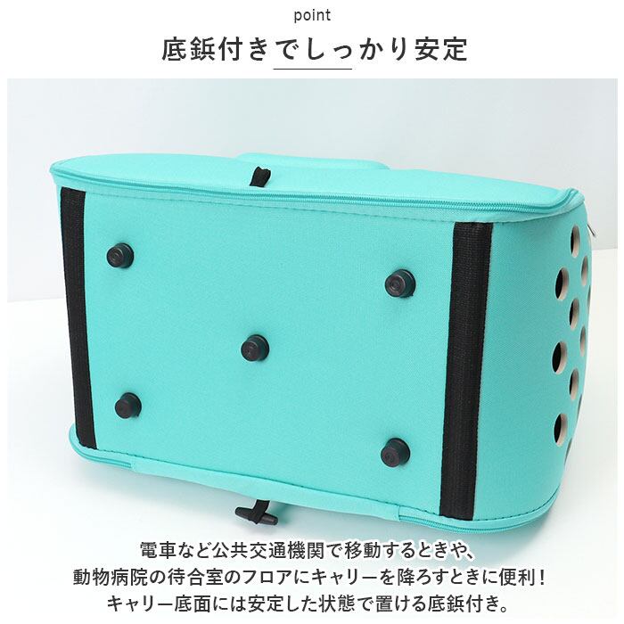 ・電車など公共交通機関で移動するときや、動物病院の待合室のフロアにキャリーを降ろすときに便利!キャリー底面には安定した状態で置ける底鋲付き。