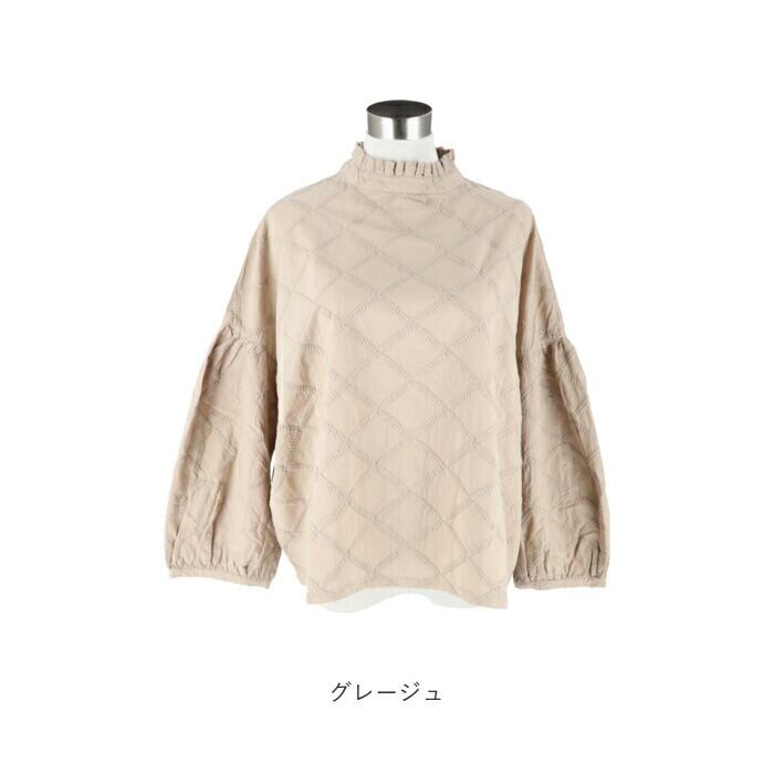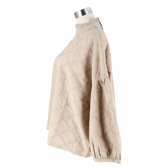 ・ぽこぽこっと立体感のある矢羽根模様を、ひし形にレイアウト。プリーツ襟のスタンドカラーデザインで、クラシカルな雰囲気と新鮮さが素敵にマッチ。