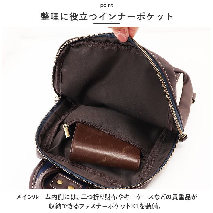 ・メインルーム内側には、二つ折り財布やキーケースなどの貴重品が収納できるファスナーポケット×1を装備。