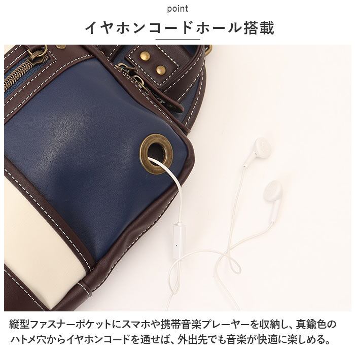 ・縦型ファスナーポケットにスマホや携帯音楽プレーヤーを収納し、真鍮色のハトメ穴からイヤホンコードを通せば、外出先でも音楽が快適に楽しめる。