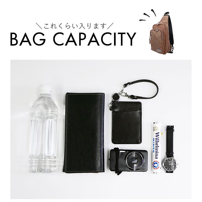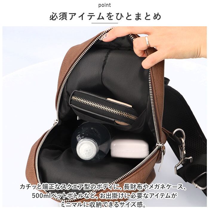 ・カチッと端正なスクエア型のボディに、長財布やメガネケース、500mlペットボトルなど、お出掛けに必要なアイテムがミニマルに収納できるサイズ感。