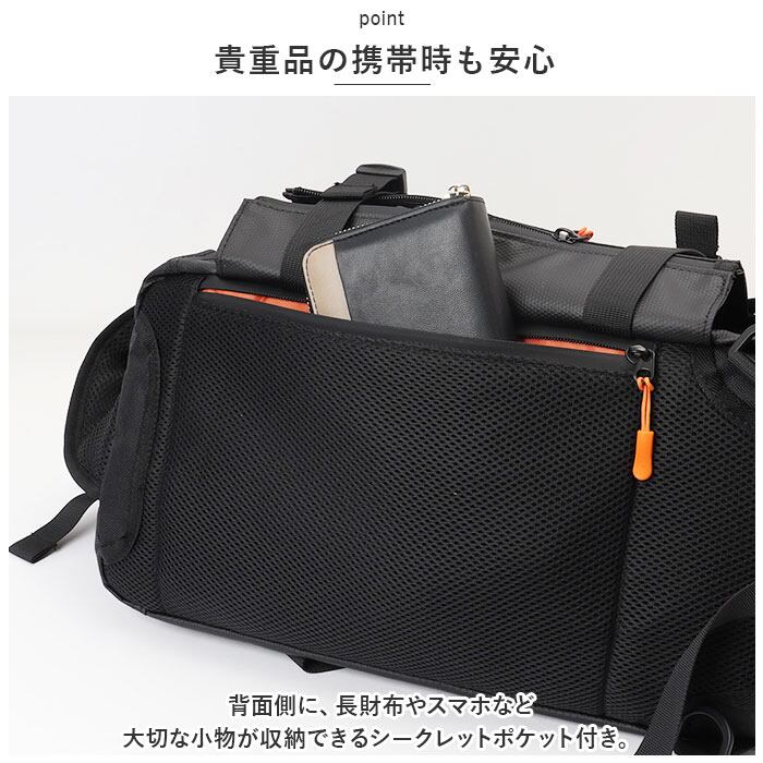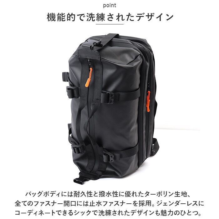 ・バッグボディには耐久性と撥水性に優れたターポリン生地、全てのファスナー開口には止水ファスナーを採用。ジェンダーレスにコーディネートできるシックで洗練されたデザインも魅力のひとつ。