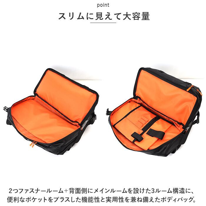 2つファスナールーム+背面側にメインルームを設けた3ルーム構造に、便利なポケットをプラスした機能性と実用性を兼ね備えたボディバッグ。