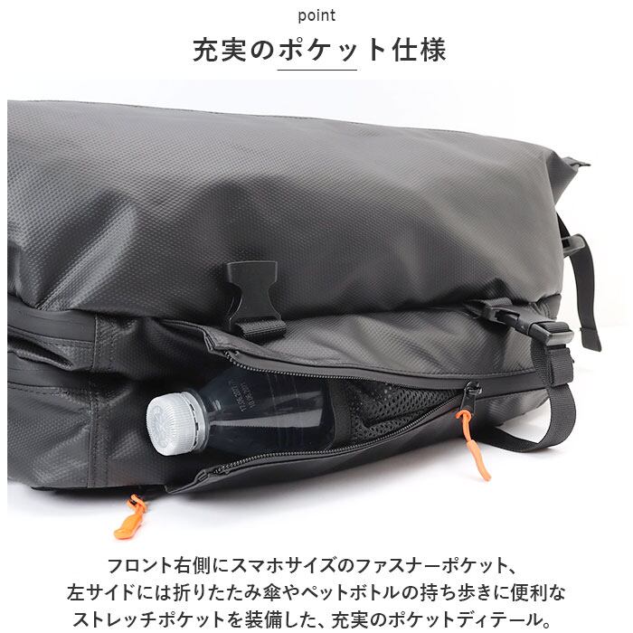 ・フロント右側にスマホサイズのファスナーポケット、左サイドには折りたたみ傘やペットボトルの持ち歩きに便利なストレッチポケットを装備した、充実のポケットディテール。