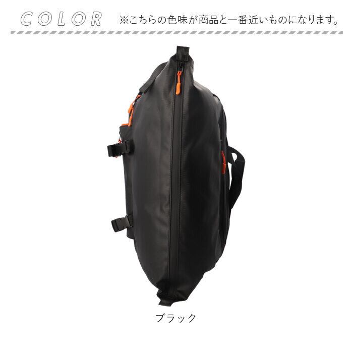 ・バッグボディには耐久性と撥水性に優れたターポリン生地、全てのファスナー開口には止水ファスナーを採用。ジェンダーレスにコーディネートできるシックで洗練されたデザインも魅力のひとつ。