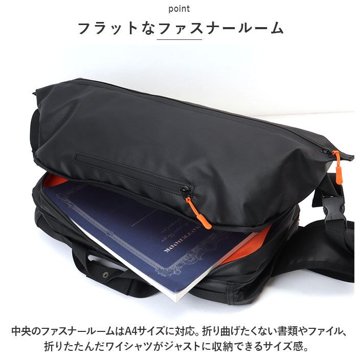 ・中央のファスナールームはA4サイズに対応。折り曲げたくない書類やファイル、折りたたんだワイシャツがジャストに収納できるサイズ感。