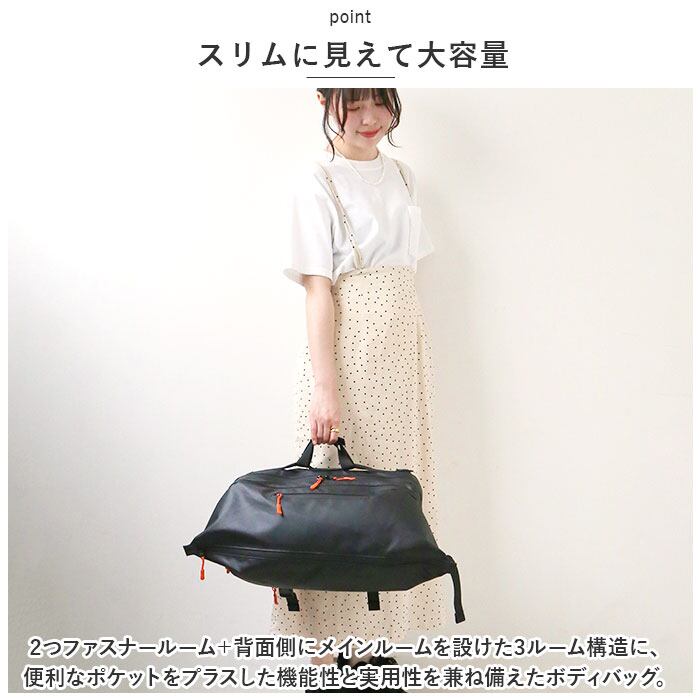 2つファスナールーム+背面側にメインルームを設けた3ルーム構造に、便利なポケットをプラスした機能性と実用性を兼ね備えたボディバッグ。