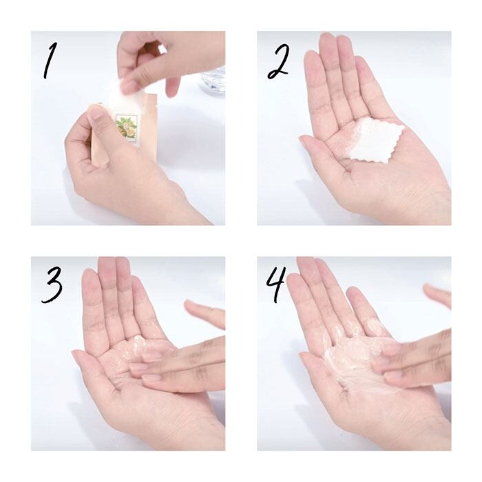・環境のために容器不使用!シートに水を加えてゆっくりかき混ぜながら溶かしていくと、クリームジェル状のクレンジングに変身★