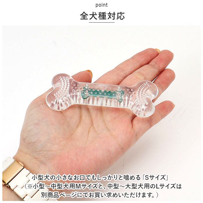 ・小型犬の小さなお口でもしっかりと噛める「Sサイズ」。(※小型~中型犬用Mサイズと、中型~大型犬用のLサイズは別商品ページにてお買い求めいただけます。)