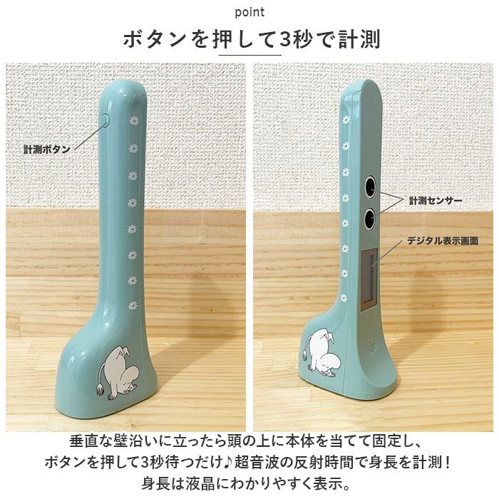 ・垂直な壁沿いに立ったら頭の上に本体を当てて固定し、ボタンを押して3秒待つだけ♪超音波の反射時間で身長を計測!身長は液晶にわかりやすく表示。