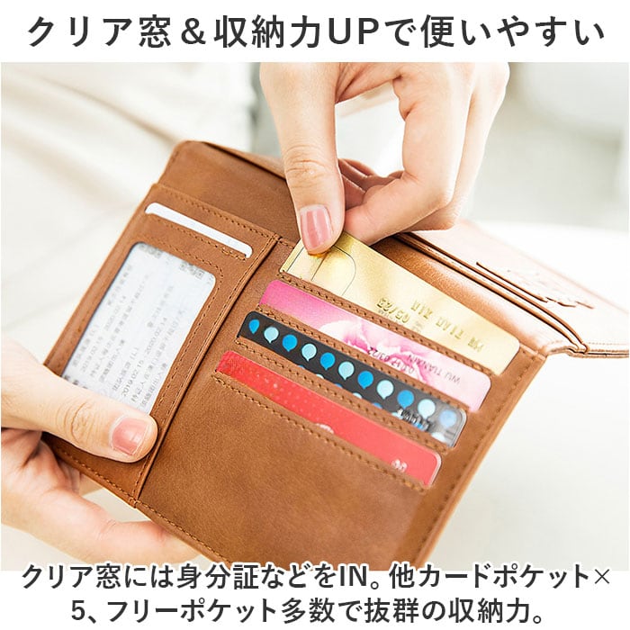 ・クリア窓には身分証などをIN。他カードポケット×5、フリーポケット多数で抜群の収納力。