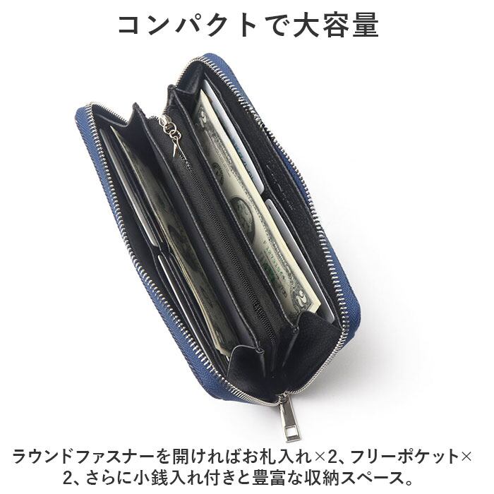 ・開口部はラウンドファスナー、内部は折りマチ構造でガバッと大きく開き、現金の出し入れがスムーズ。お会計時もたつかないのも魅力。
