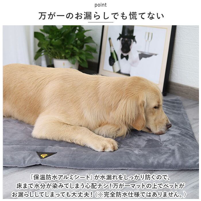 ・「保温防水アルミシート」が水漏れをしっかり防ぐので、床まで水分が染みてしまう心配ナシ!万が一マットの上でペットがお漏らししてしまっても大丈夫!(※完全防水仕様ではありません。)