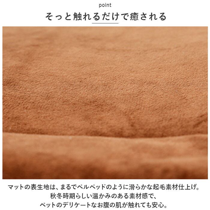 ・マットの表生地は、まるでベルベッドのように滑らかな起毛素材仕上げ。秋冬時期らしい温かみのある素材感で、ペットのデリケートなお腹の肌が触れても安心。