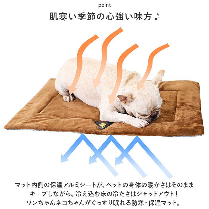・マット内側の保温アルミシートが、ペットの身体の暖かさはそのままキープしながら、冷え込む床の冷たさはシャットアウト!ワンちゃんネコちゃんがぐっすり眠れる防寒・保温マット。