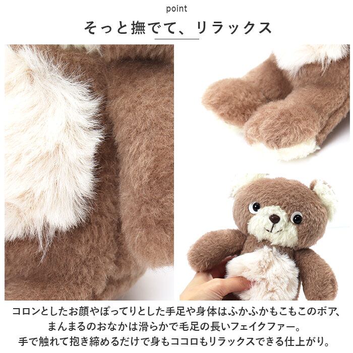 ・コロンとしたお顔やぽってりとした手足や身体はふかふかもこもこのボア、まんまるのおなかは滑らかで毛足の長いフェイクファー。手で触れて抱き締めるだけで身もココロもリラックスできる仕上がり。